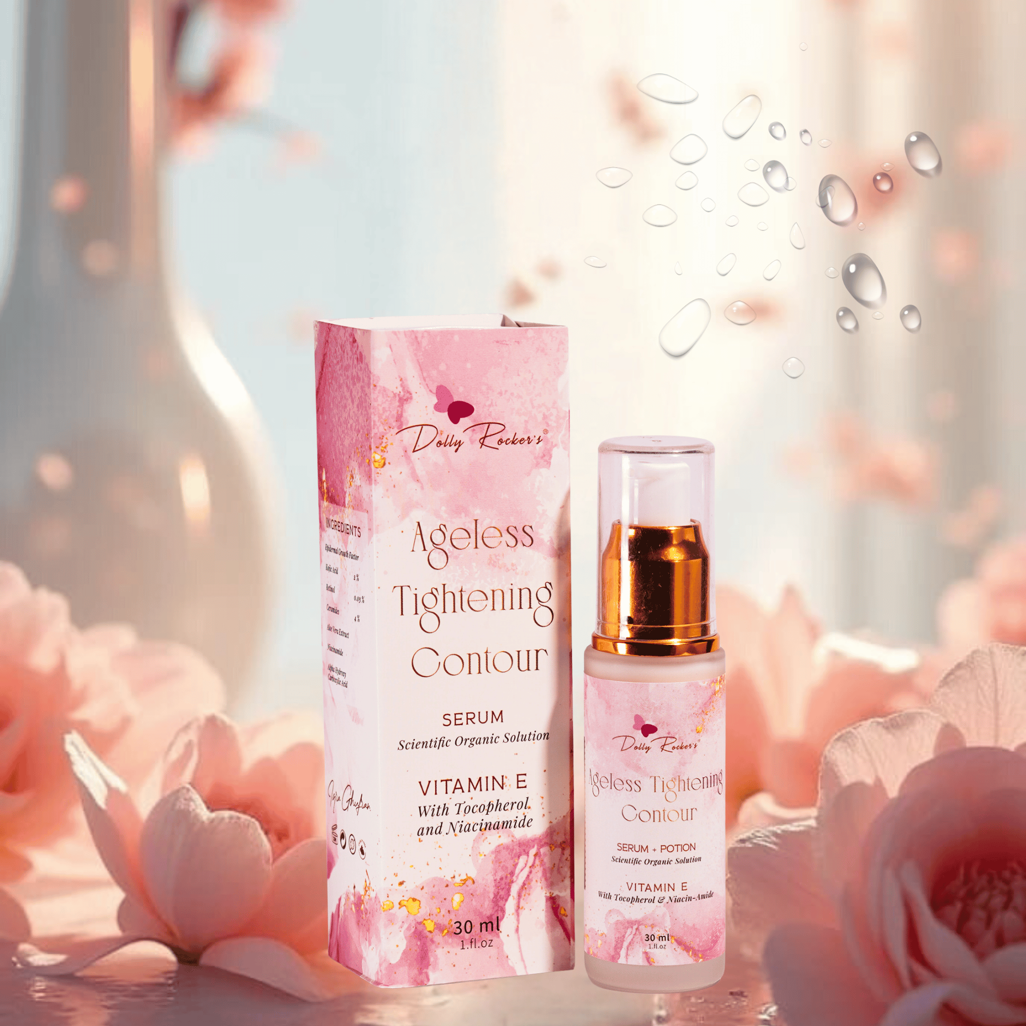 Are you upset about aging? Dolly Rockers ageless tightening contour has an optimal solution for it. With combination of ceramides, Glycolic acid and aloe-vera tightens contour, reduces skin barriers and improves 30% of skin elasticity after using it consistently for three weeks. With Vitamin E and Tocopherol helps produces collagen, retains moisture and helps tighten skin. It can help reduces fine lines and wrinkles. It boosts skin cells regeneration. It is a powerful anti-oxidant.