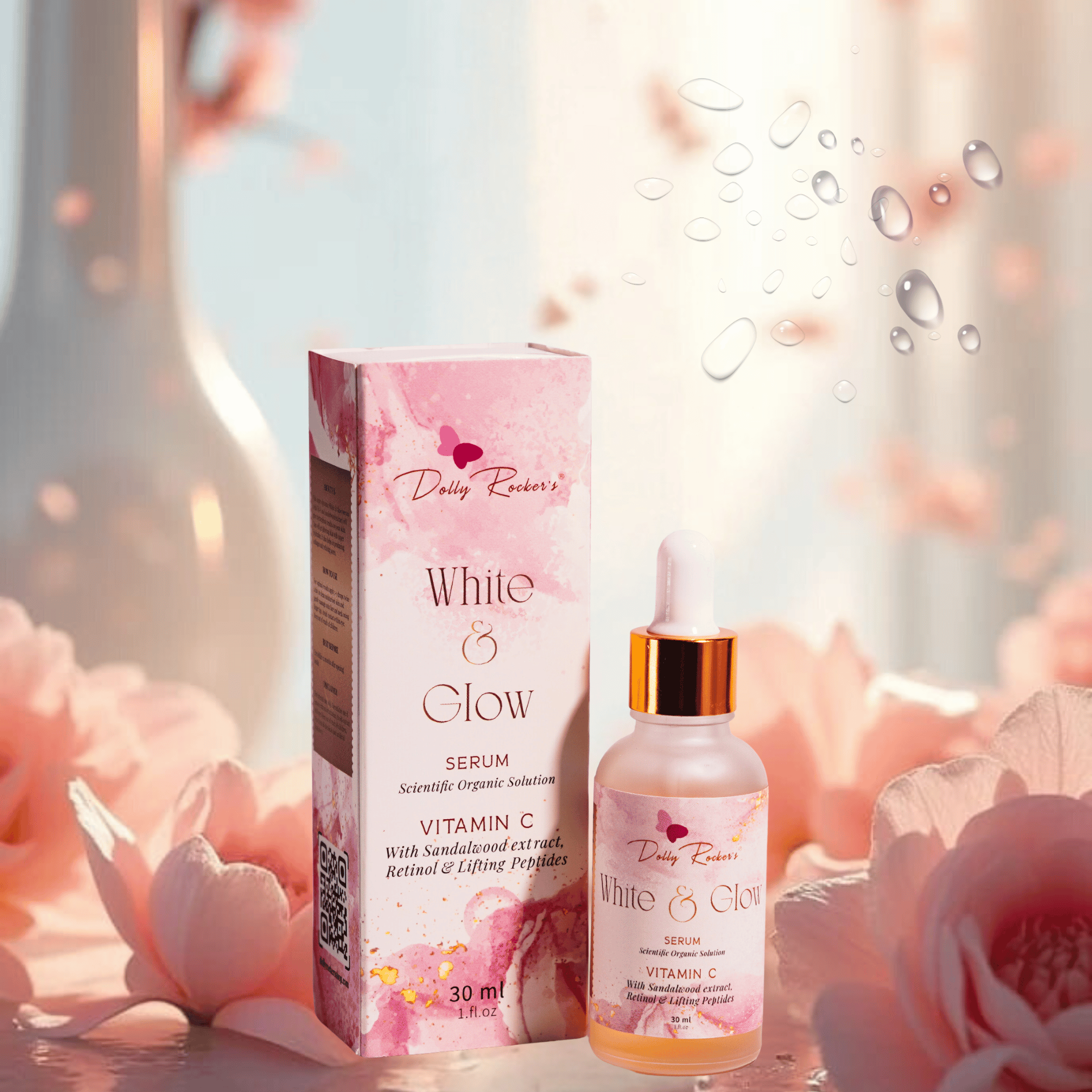Dolly rockers White & Glow Serum with Vitamin C, Retinol, Hyaluronic acid & Sandalwood extract helps brighten your skin, reduces inflammation & dark spots to give a more twinkling & radiant texture. The blend of tocopherol reduces anti-aging & anti-oxidants from your skin. This lightweight formula absorbs quickly. The exact percentage of niacinamide minimize pores, treat hyper pigmentation & skin cancer risk. Keeps your skin hydrated for long hours. Safe for sensitive skin.